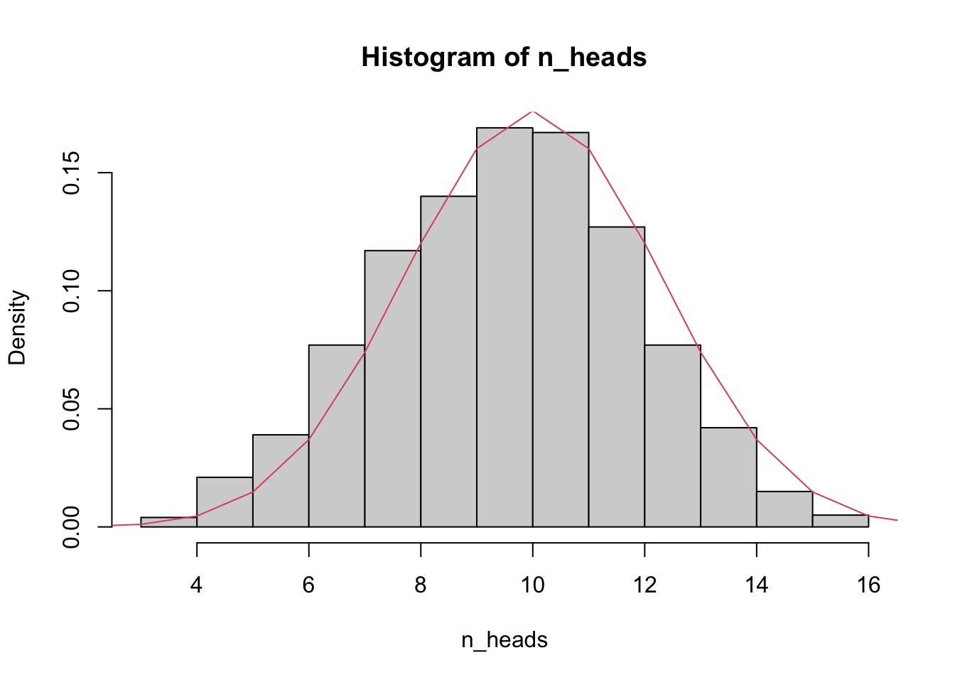 # Number of simulationsk <-1000# Number of coinsn <-20# Store the resultsn_heads <-numeric(k)# Initialize random generatorset.seed(100)# Run simulationsfor (i in1:k) { toss <-sample(c('H','T'), n, replace = T) n_heads[i] <-sum(toss =='H')}# Plot distributionhist(n_heads, probability=TRUE)# Overlay the Binomial PMFcurve(choose(n,x)*0.5^x *0.5^(n-x), from=1, to=n, n=n, col=2, add=T)