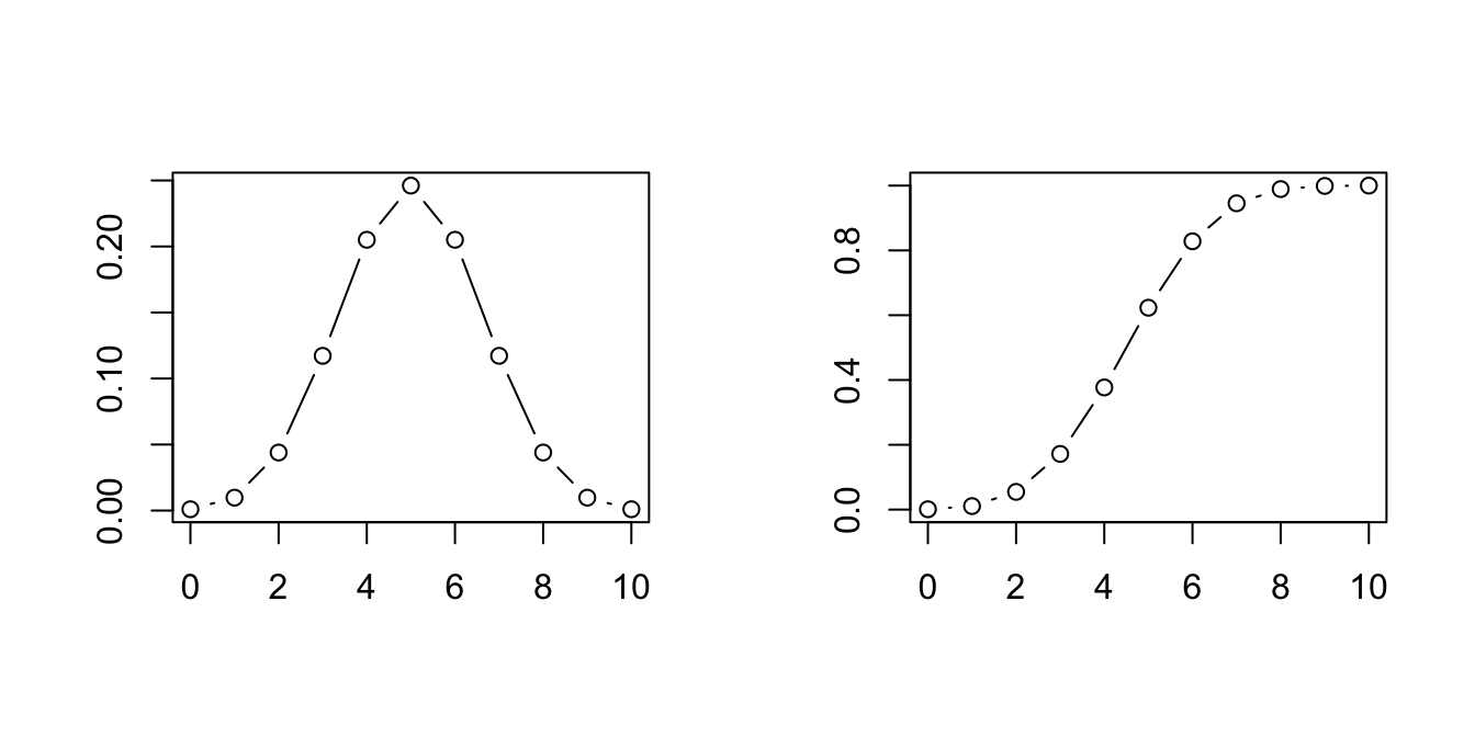 # computes P(X=5) for Bin(10,0.5)p <-dbinom(5, 10, 0.5)par(mfrow=c(1,2))# plot the PMF for Bin(10,0.5)curve(dbinom(x, 10, 0.5), from=0, to=10, n=11, type="b", ann=F)# `pbinom` computes the CDF curve(pbinom(x, 10, 0.5), from=0, to=10, n=11, type="b",ann=F)