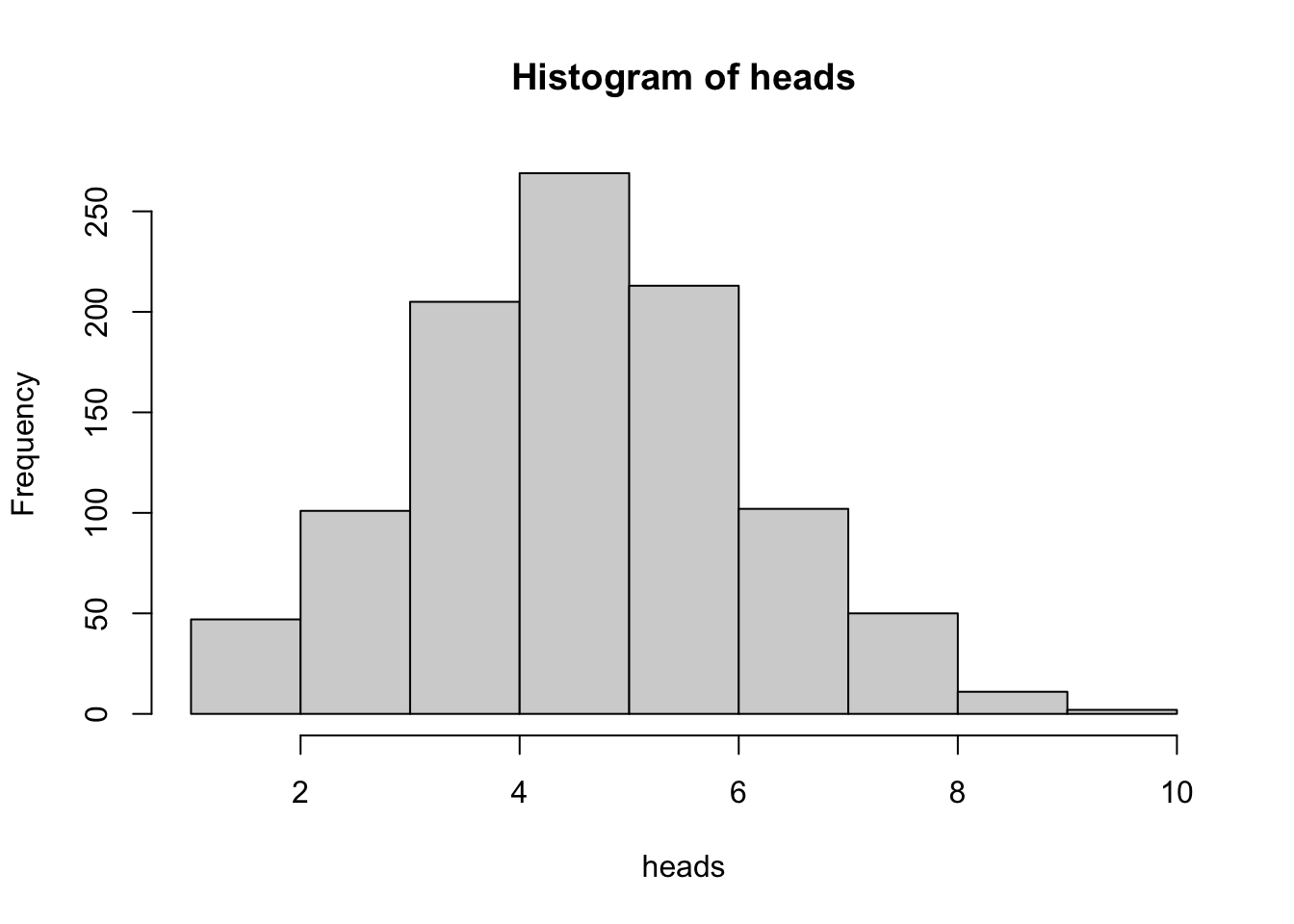 # draw a random value from a given Binomial distribution# this allows us to simulate a random experiment# e.g. the number of heads when flipping 10 fair coinsoutcome <-rbinom(1, 10, 0.5)# Repeat the experiment 1000 timesheads <-rbinom(1000, 10, 0.5)# the histogram will converge to the ideal Binomial distribution# if the experiment is repeated a large number of timeshist(heads)