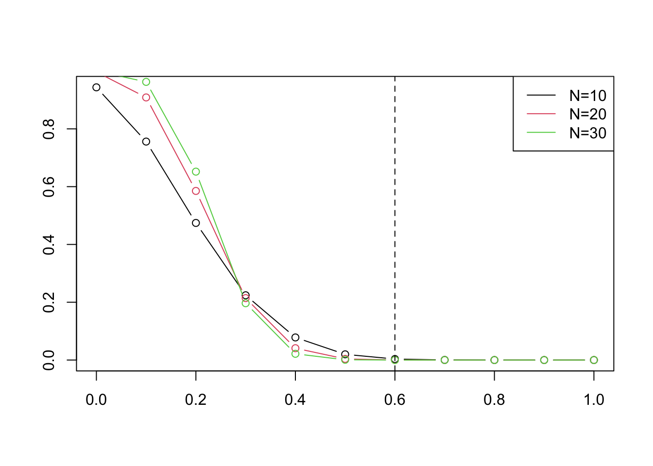 # Percentage of correct answersx <-seq(0, 1, .1)# Survival probabilities for different Ny1 <-1-pbinom(10*x, 10, .25)y2 <-1-pbinom(20*x, 20, .25)y3 <-1-pbinom(30*x, 30, .25)# Compare the curves for different Nplot(x, y1, type="b", col=1, ann=F)lines(x, y2, type="b", col=2)lines(x, y3, type="b", col=3)# Indicating passing the examabline(v=0.6, lty=2)# Add a legend at the top right corner of the plotlegend("topright", c("N=10", "N=20", "N=30"), lty=1, col=1:3)