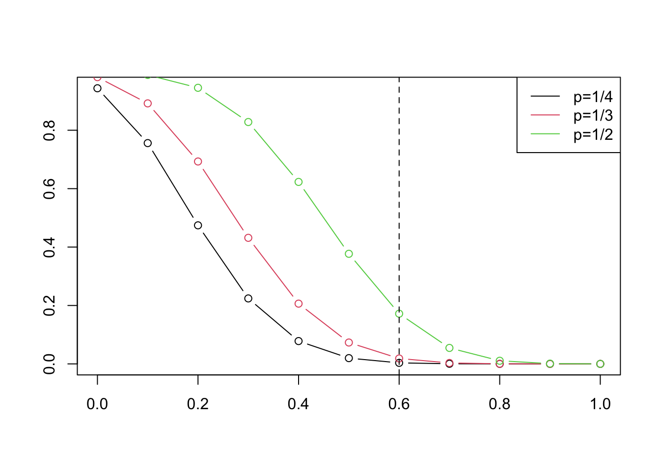 # Percentage of correct answersx <-seq(0, 1, .1)# Survival probabilities for different p (number of choices)y1 <-1-pbinom(10*x, 10, .25)y2 <-1-pbinom(10*x, 10, .33)y3 <-1-pbinom(10*x, 10, .5)# Compare the curves for different pplot(x, y1, type="b", col=1, ann=F)lines(x, y2, type="b", col=2)lines(x, y3, type="b", col=3)# Indicating passing the examabline(v=0.6, lty=2)# Add a legend at the top right corner of the plotlegend("topright", c("p=1/4", "p=1/3", "p=1/2"), lty=1,col=1:3)
