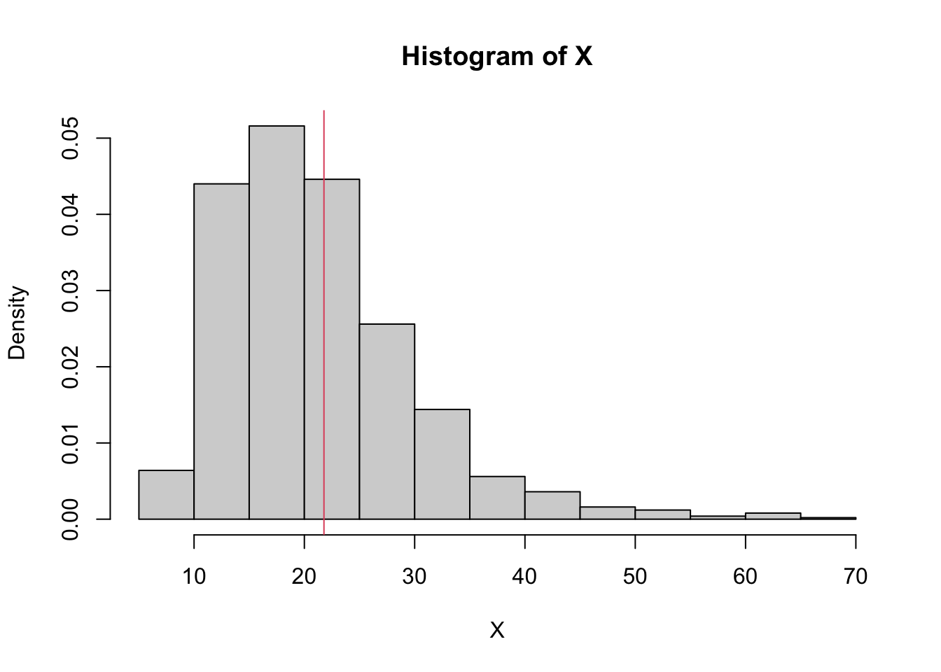 # number of simulationsN <-1000# number of toys bought in each simulationX <-numeric(N)# the set of toysToys <-c('🧸','🐢','🐣','🐤','🐼','🤖','🐸','🐷')set.seed(100)# run simulationfor (i in1:N) { C <-c() # the collection of toys bought# repeat until a full set is collectedwhile(TRUE) { t <-sample(Toys, 1, replace=T) C <-c(C, t)if(setequal(C, Toys)) break } X[i] <-length(C)}hist(X, probability = T)abline(v =mean(X), col =2)