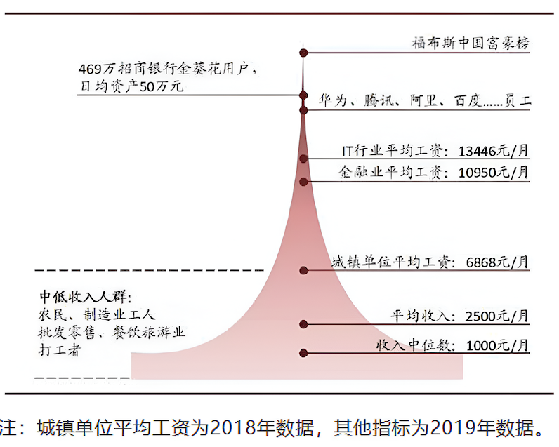 Example 36.1 (Income distribution) The main reason why the median is sometimes preferred over the mean is that the median is more robust to extreme values. A typical example is the income distribution. Higher incomes are rare, but their absolute values are high. Thus, the mean income tends be higher than what the mass of the population would earn. But the median is more robust to extreme values and is closer to the earnings of an “average” person. For example, the average monthly income in China is \(\yen 2,500\) in 2019, but the median is only \(\yen 1,000\).