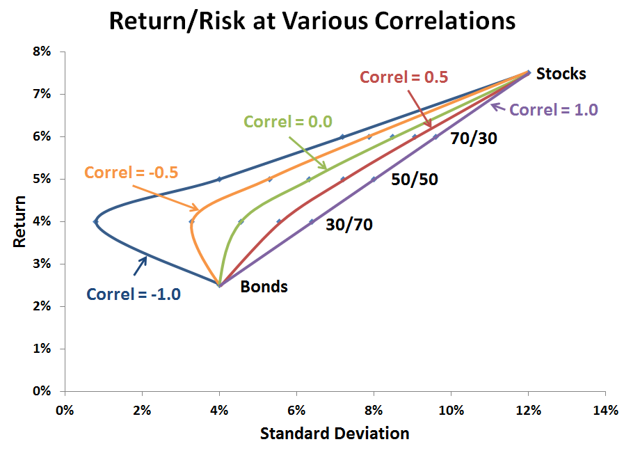 As we see, by reducing the correlation between the two assets, we reduced the portfolio risk, though the expected return remains the same. Therefore, diversification is often referred to as a “free lunch” in finance because it allows investors to reduce portfolio risk without sacrificing expected returns.
