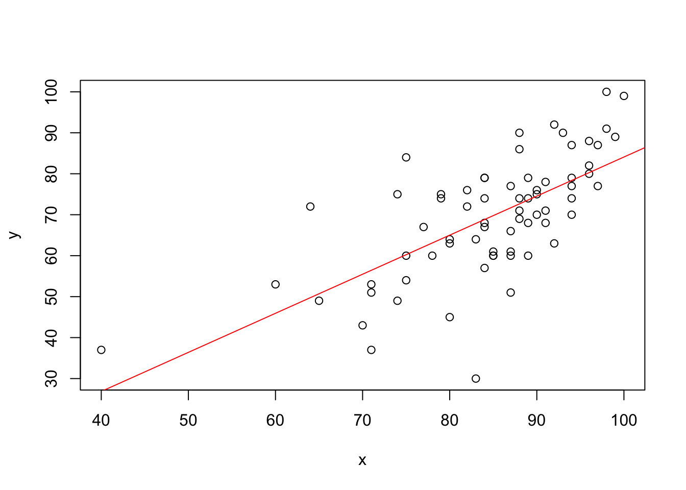 # load dataexam <-read.csv("../dataset/exam.csv")# midterm scorex <- exam$mid# final scorey <- exam$final# regress y on x, compute coefficientsb <-cov(x,y)/var(x)a <-mean(y) - b*mean(x)# plot the data and the regression lineplot(x,y)abline(a,b,col="red")