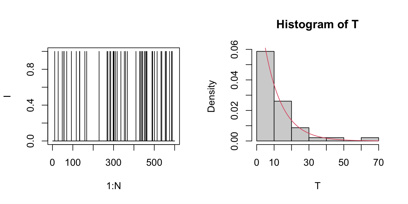 # Simulate random arrivals and inter-arrival timeN <-600# total simulation timep <- .1# prob of occurrence per unit timeset.seed(0) # I[t] = 1 if an event occurs in time t I <-1* (runif(N) < p) par(mfrow=c(1,2))# plot the random occurrenceplot(1:N, I, type ="h")# inter-arrival timeT <-diff( (1:N)[I==1] )# distribution if waiting time hist(T, prob=TRUE)# Overlay the exponential functioncurve(exp(-x/10)/10, col =2, add =TRUE)