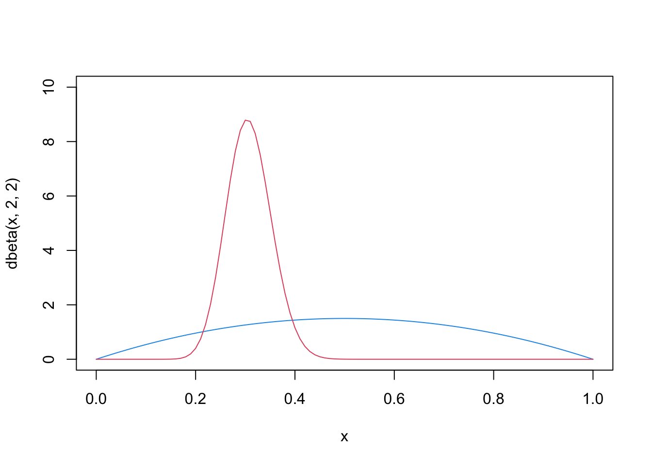 # unknown parameterp <-0.3# number of observationsn <-100# generate Bernoulli observationsX <-1* (runif(n) < p)# sum of positive outcomesk <-sum(X)# the prior distribution (blue)curve(dbeta(x, 2, 2), col=4, ylim=c(0,10))# the posterior distribution (red)curve(dbeta(x, 2+k, 2+n-k), col=2, add=TRUE)